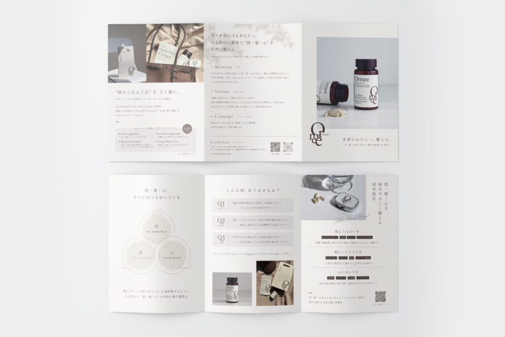 「がんばらない美容」をコンセプトに掲げ、日常の中で無理なく続けられるケアを大切にしているOrmeeさま。 ブランドがもつ“自然体の美しさ”と“穏やかな心地よさ”を表現するため、パンフレットでは ウォームベージュ×ブラウン を基調に、やさしく落ち着いたトーンでデザインしました。