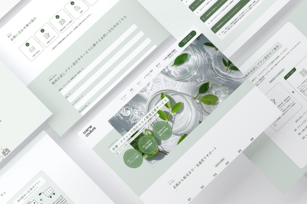 今回ご依頼いただいたのは、医師・クリニック向けコスメ開発支援サービスを提供されているコスメクチュール様。「シンプル、信頼感、洗練されている、この会社にお願いするとクオリティの高いコスメを作ってくれるのだろうなという安心感」を意識したいとのご希望でした。